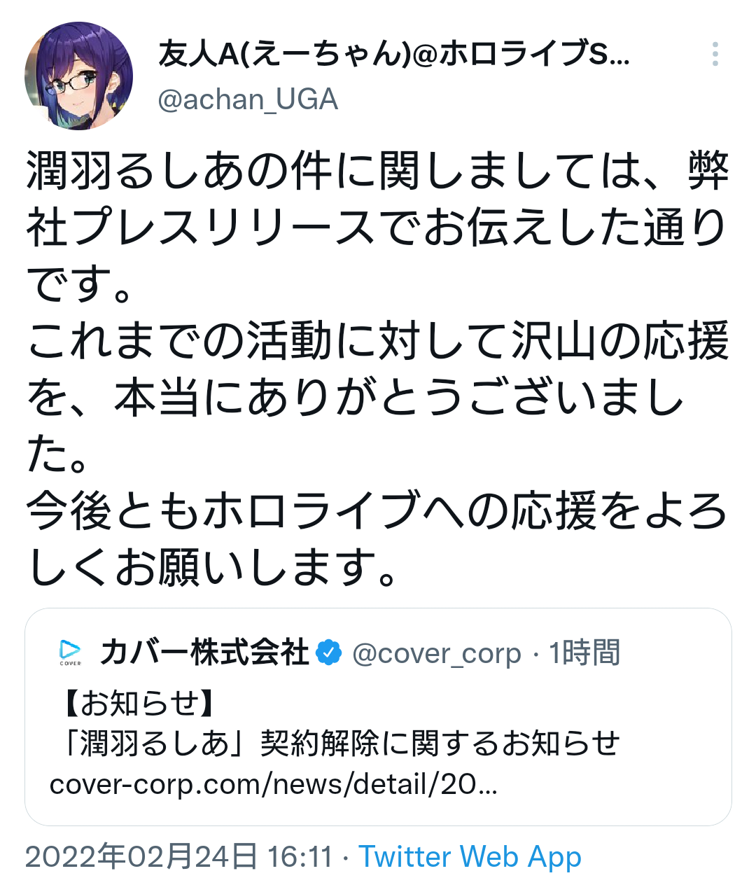 ホロライブVTuber潤羽るしあ、情報漏洩でクビ