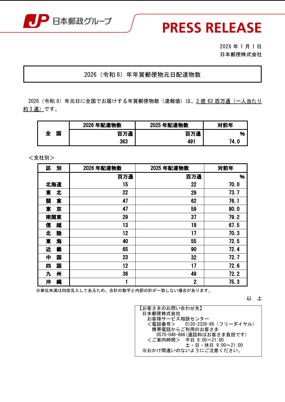 [26/01/06] 激裏GATE PRESS No.10351 年賀状激減、10年で5分の1に 2026/01/06