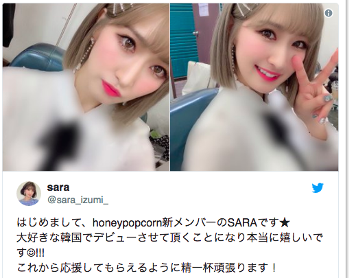 しかしこの度、芸名を「SARA」に変更、メンバー全員がAV女優、韓国で活動する歌手グループ「HONEY POPCORN」に加入AV堕ち目前と言われている。