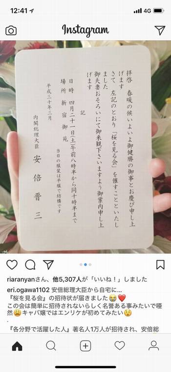 招待状が安倍総理より届いたとインスタにアップし